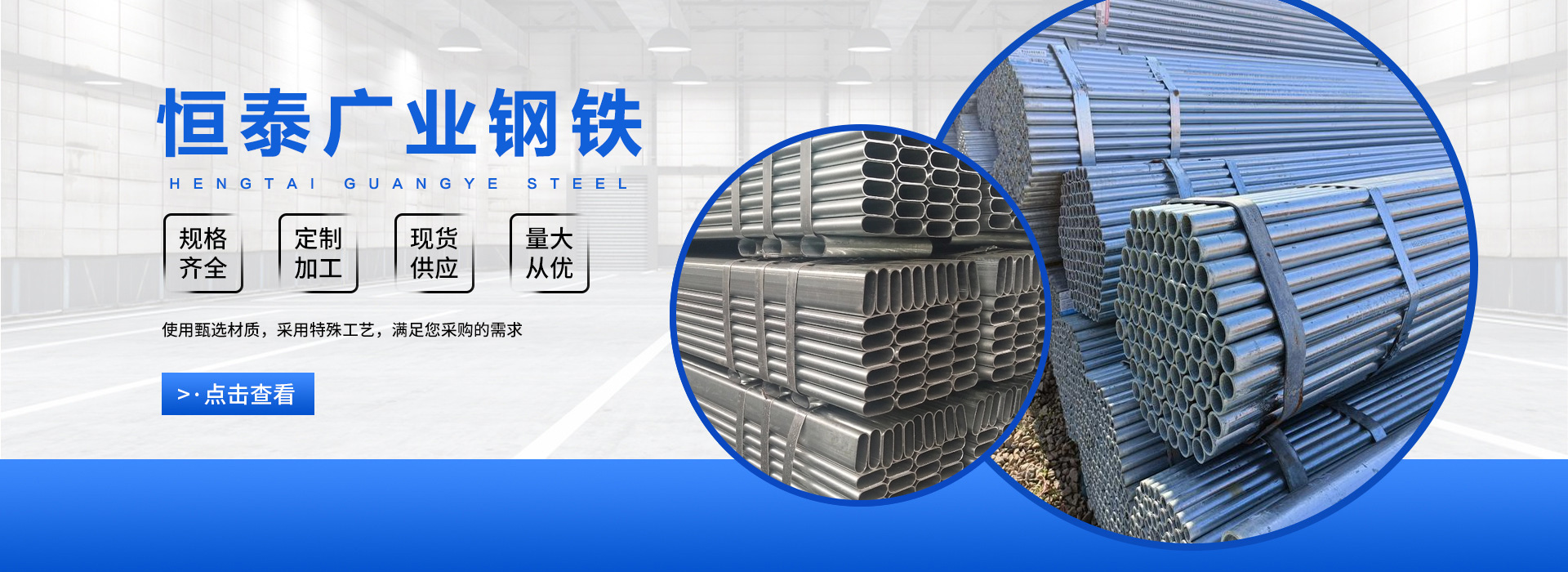 天津恒泰廣業鋼鐵有限公司是一家從事鋼鐵流通企業。本公司經過多年的努力已在華東、華北、華南地區建立起良好的信譽,不僅在同行市場營銷上取得成績,而且將直銷作為公司主要銷售模式,為直接用戶提供優惠價格、合格品質的鋼材資源,直接降低了廣大用戶的采購成本,贏的廣大鋼材采購商的信任。 天津恒泰廣業鋼鐵有限公司主營大棚管,鍍鋅管,鍍鋅方矩管,鍍鋅帶圓管,鍍鋅帶方矩管,鍍鋅H型鋼,鍍鋅角鋼,鍍鋅槽鋼,鍍鋅扁鋼,鍍鋅圓鋼等.供應溫室大棚,幕墻公司,公路設施,鋼構工程用材, 產品規格范圍: 鍍鋅鋼管4分-10寸,鍍鋅方管:20*20—800*800,選擇天津恒…
